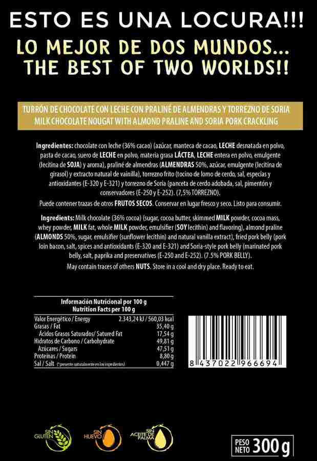 Turrón artesano gourmet elaborado con el mejor chocolate belga con lechepraliné de almendras con crujiente de torreznos de Soria.
