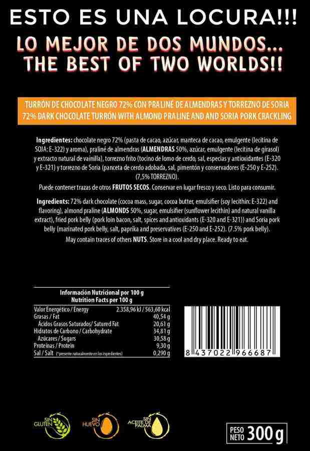 Turrón artesano gourmet elaborado con el mejor chocolate belga negropraliné de almendras con crujiente de Torreznos de Soria.
