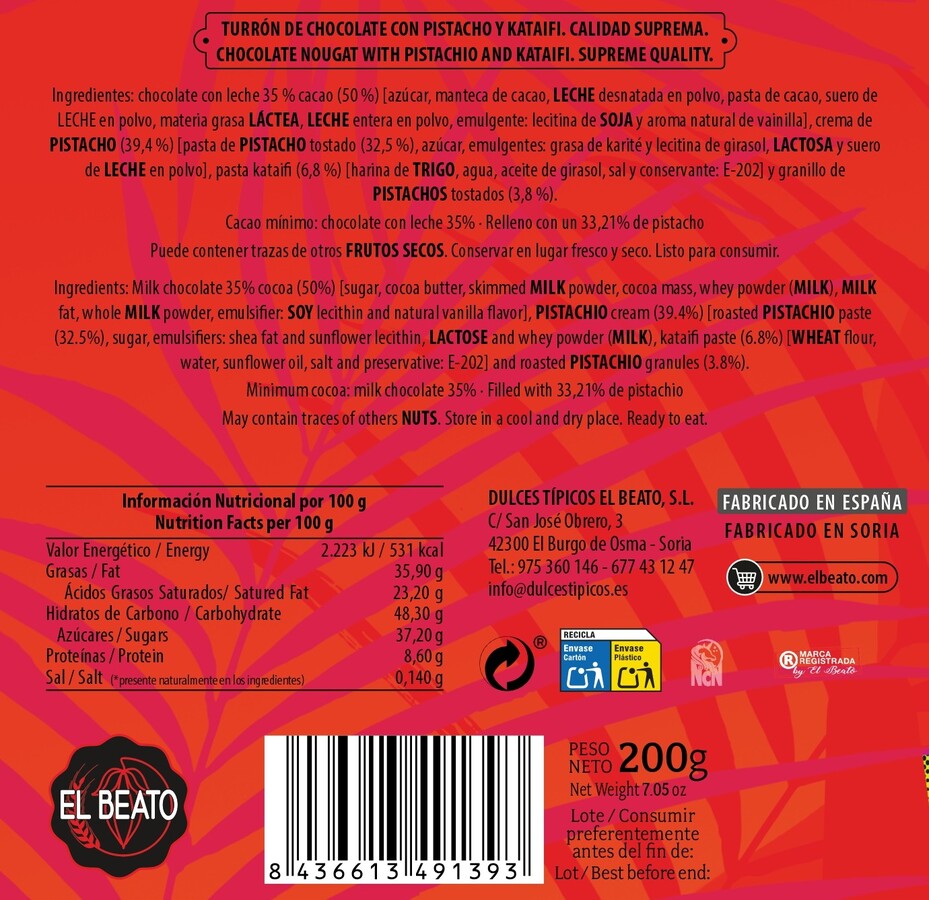 Mucho más que un chocolate Dubái de PISTACHO y KATAIFI: ¡200 gramos de pura indulgencia! El doble de tamaño que otros de otras marcas, porque en El Beato, cuando hacemos algo, lo hacemos a lo grande.